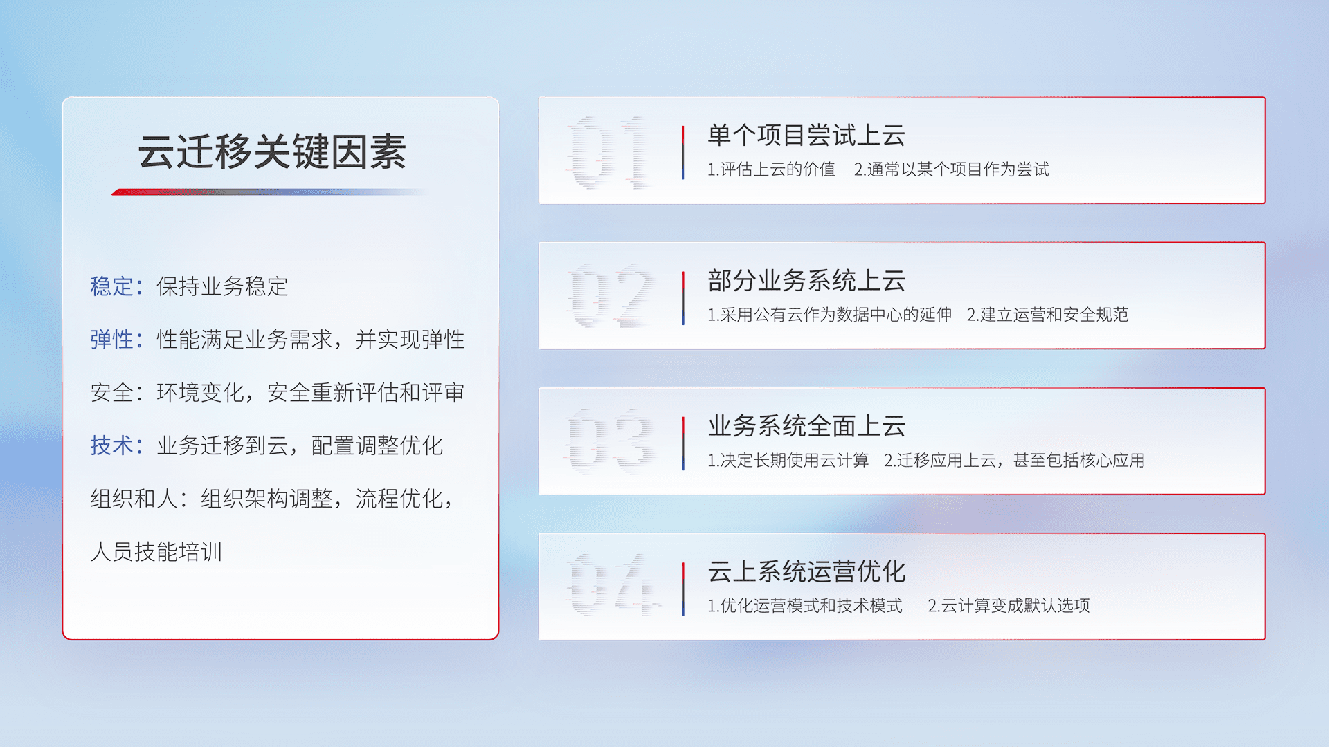 结合实际业务,,从规划设计、、云平台选型、、、、云原生改造、、、数据迁移、、、集成交付,,,,迁移全过程为客户识别最佳上云路径,,,做好风险识别管理,,,,设计网络架构、、、身份权限、、安全审计合规、、、操作审计、、日志审计、、、监控告警策略、、、多站点容灾设计等,,,,对云上基础设施进行整体规划,,,提升IT治理水平,,以满足弹性、、、高可用、、高性能的需求。。。。
