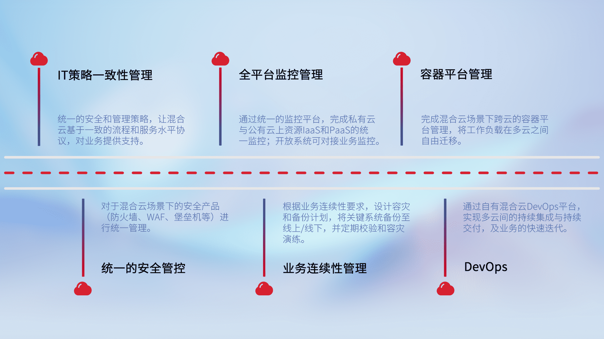 通过多云纳管,,,以统一的资源数据模型把客户的云资源进行抽象和封装,,进而实现对多云资源的统一操作,,,保障云资源管理的可靠性、、、稳定性与可用性。。。。量身定制化运维内容,,配置、、、开发运维、、、、补丁管理、、备份、、监控、、认证和访问管理、、审计和日常巡检等,,,保障在用云过程中的可靠度,,,,稳定度以及高可用率。。。。