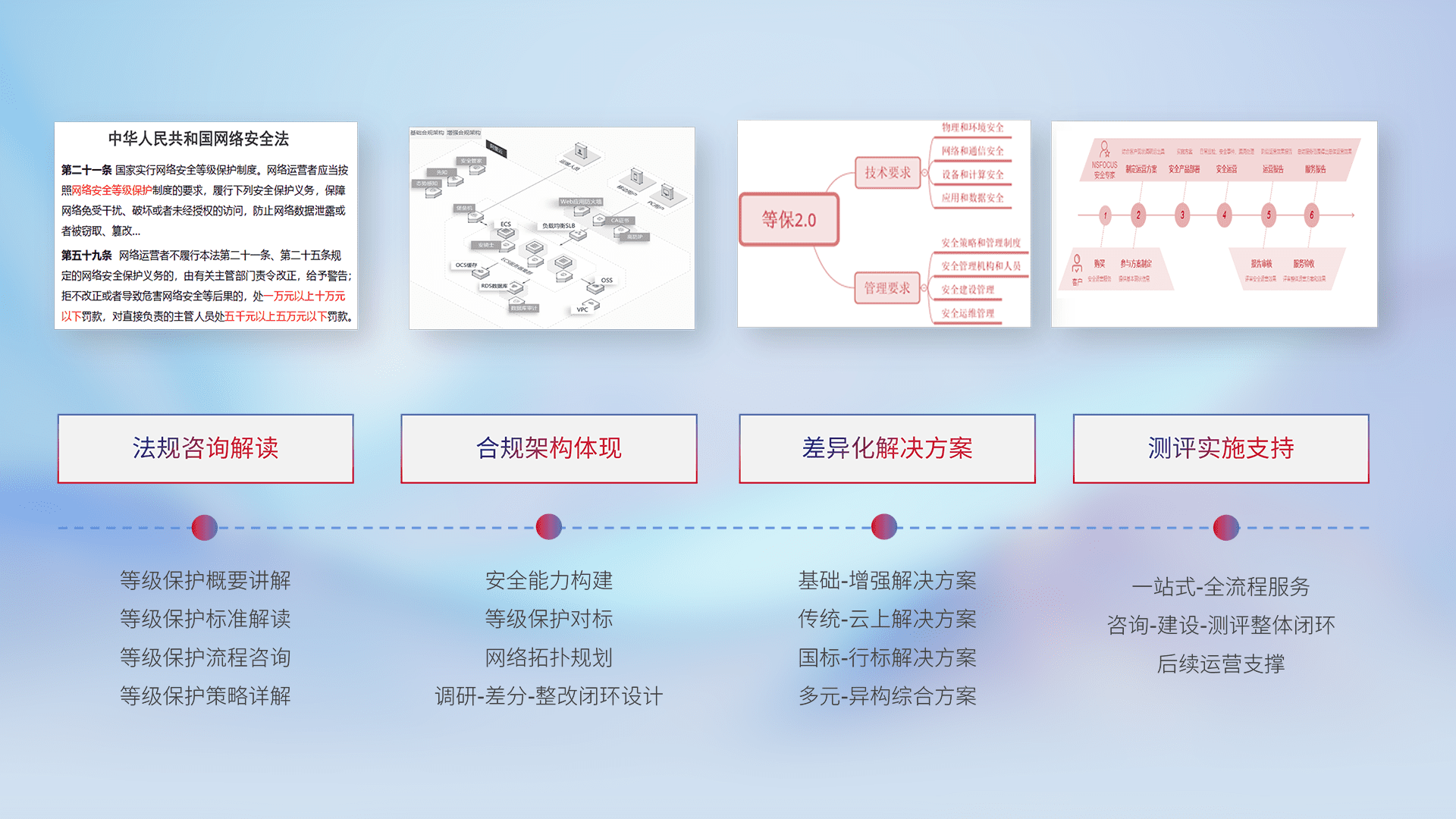 通过专业的法律咨询解读、、、合规架构体现、、、、差异化解决方案、、、测试实施支持等服务,,,为客户量身打造等保合规体系。。。。